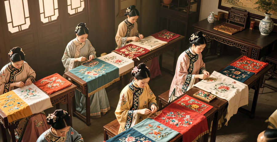 Professional embroideresses are putting the finishing touches on exquisite embroidery works. The pieces boast bright, vivid colors and rich patterns, including floral motifs and more.