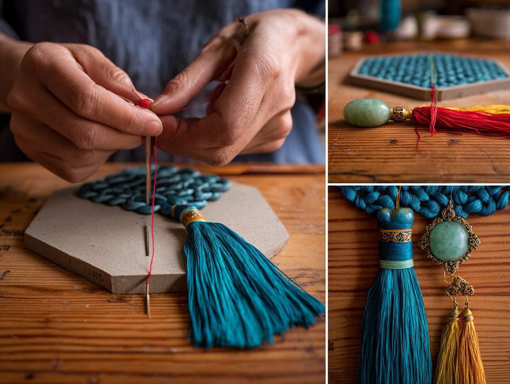 The charm of Chinese knots lies not only in their profound cultural connotations but also in their exquisite and ingenious production process. Behind the seemingly simple knots is the craftsman’s precise control of thread materials, tools, and techniques. Firstly, in terms of thread material selection, traditional Chinese knots mostly use silk threads, cotton threads, or nylon threads that are tough in texture and bright in color. Common colors include Chinese red, bright yellow, and royal blue. Among them, “Chinese red” has become the most classic color matching because it symbolizes “joy and auspiciousness”. Some high – end works also use gold threads and silver threads for weaving to add a luxurious texture. In terms of tools, scissors, lighters (used for fusing the ends of threads), foam boards, and positioning pins (used for fixing the shape of knots) are essential. Craftsmen need to rely on these tools to ensure the symmetry of the knot shape and the smoothness of the threads. The production process is usually divided into four steps: “starting the knot, weaving the knot, finishing the knot, and decorating”. When starting the knot, it is necessary to determine the length of the thread and the center point of the knot shape to ensure the symmetry of the subsequent weaving. Weaving the knot is the most crucial link. Craftsmen need to remember the weaving formulas for different knot shapes and use the techniques of “pressing, picking, threading, and winding” to make the threads interweave in an orderly manner in their hands. Especially for complex combined knots, it often requires dozens or even hundreds of interlacings, and a slight mistake will require re – weaving. When finishing the knot, it is necessary to tighten the threads and adjust the tightness of the knot shape to ensure that the knot is plump and not loose. Finally, according to needs, jade pendants, agates, tassels, and other decorations can be hung under the knot to enhance the aesthetics and cultural charm of the work.