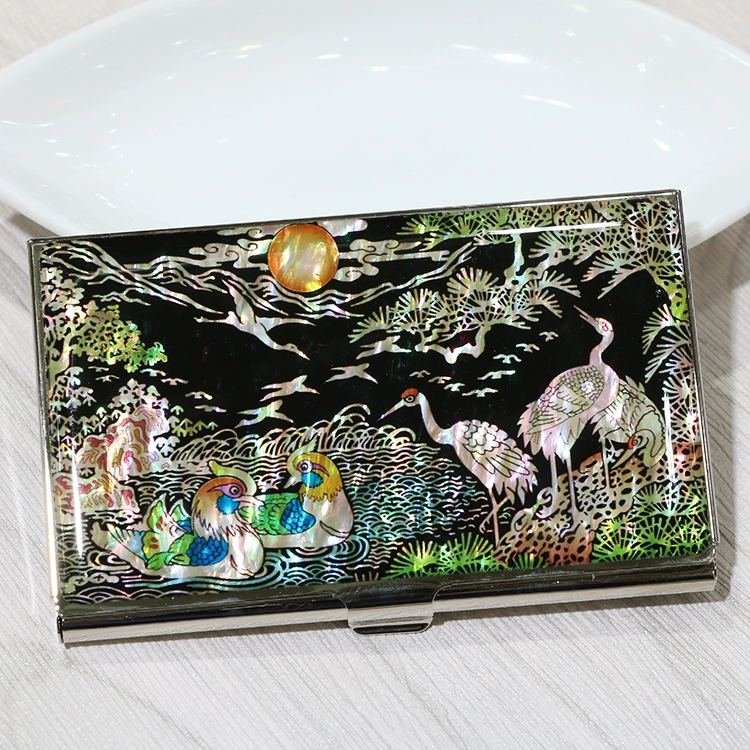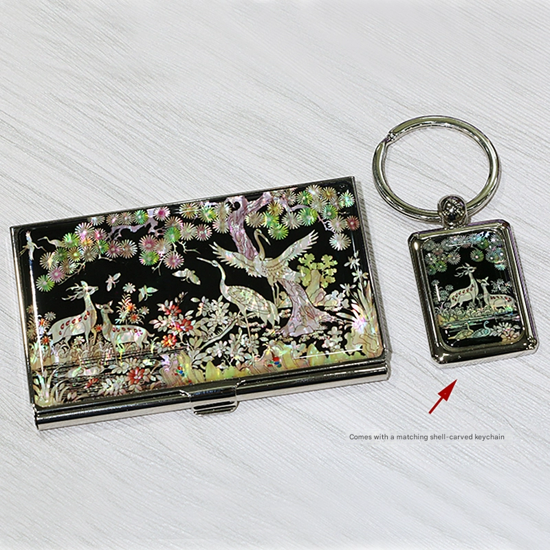 Hand-carved mother-of-pearl lacquerware inlaid with shells. Crane-shaped business card holder, card case, and keychain set. Perfect gift